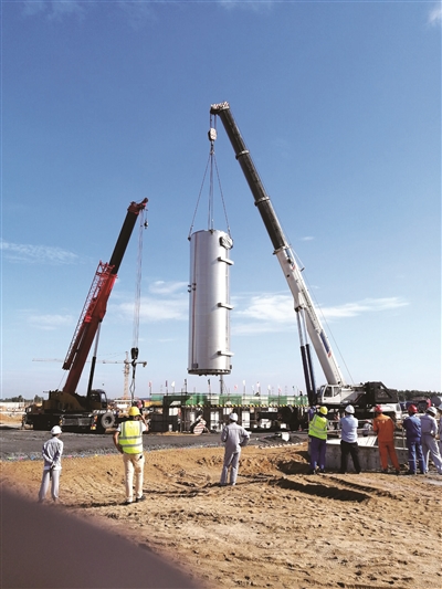 ????????11月2日,中國化學(xué)工程第六建設(shè)有限公司承建的海南華盛26萬噸/年非光氣法聚碳酸酯(PC)項(xiàng)目3臺(tái)導(dǎo)熱油爐主體吊裝一次性就位。