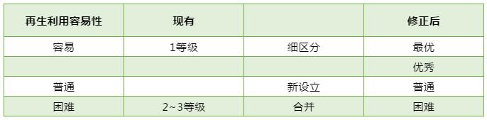 ????????在該修正案中, 將9種包裝材質(zhì)再生利用等級從1~3等級改進(jìn)為最優(yōu),優(yōu)秀,普通,差4個級別,將原來的1等級分解成最優(yōu)和優(yōu)秀,2~3等級合并成差,增加了普通等級。