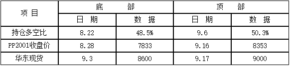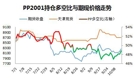 ????????第二、7月以來多空比曲線下行過程中,PP期現(xiàn)價(jià)格并不同步,多空比形成階段性底部和頂部相對(duì)領(lǐng)先,在50%臨界線之下,多單逐步增加,多空比逐步提升,此時(shí)配合基本面情況,有擇機(jī)介入短多的機(jī)會(huì)。多空比在8月22日達(dá)到階段性底部48.5%,之后開始一波反彈,多空比的底部領(lǐng)先期現(xiàn)價(jià)格一周左右時(shí)間,8月28日PP2001收盤7833元/噸,華東現(xiàn)貨在9月3日8600元/噸,相繼形成底部;9月6日,持倉多空比50.3%形成階段性頂部,且50%臨界線之上僅僅維持兩天就再次轉(zhuǎn)頭下行,此次多空比領(lǐng)先了期現(xiàn)價(jià)格10天左右。總之當(dāng)多空比、期貨和現(xiàn)貨價(jià)格同向而行,“共振”之際,方可順勢而為。