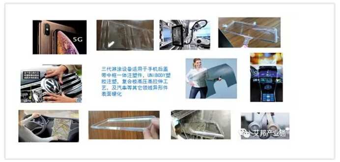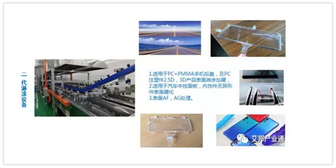 ????????二代淋涂設(shè)備主要應(yīng)用于PC+PMMA手機后蓋,及PC注塑件2.5D,3D產(chǎn)品、汽車中控面板,內(nèi)飾件無異形件表面硬化、表面AF、AG處理。