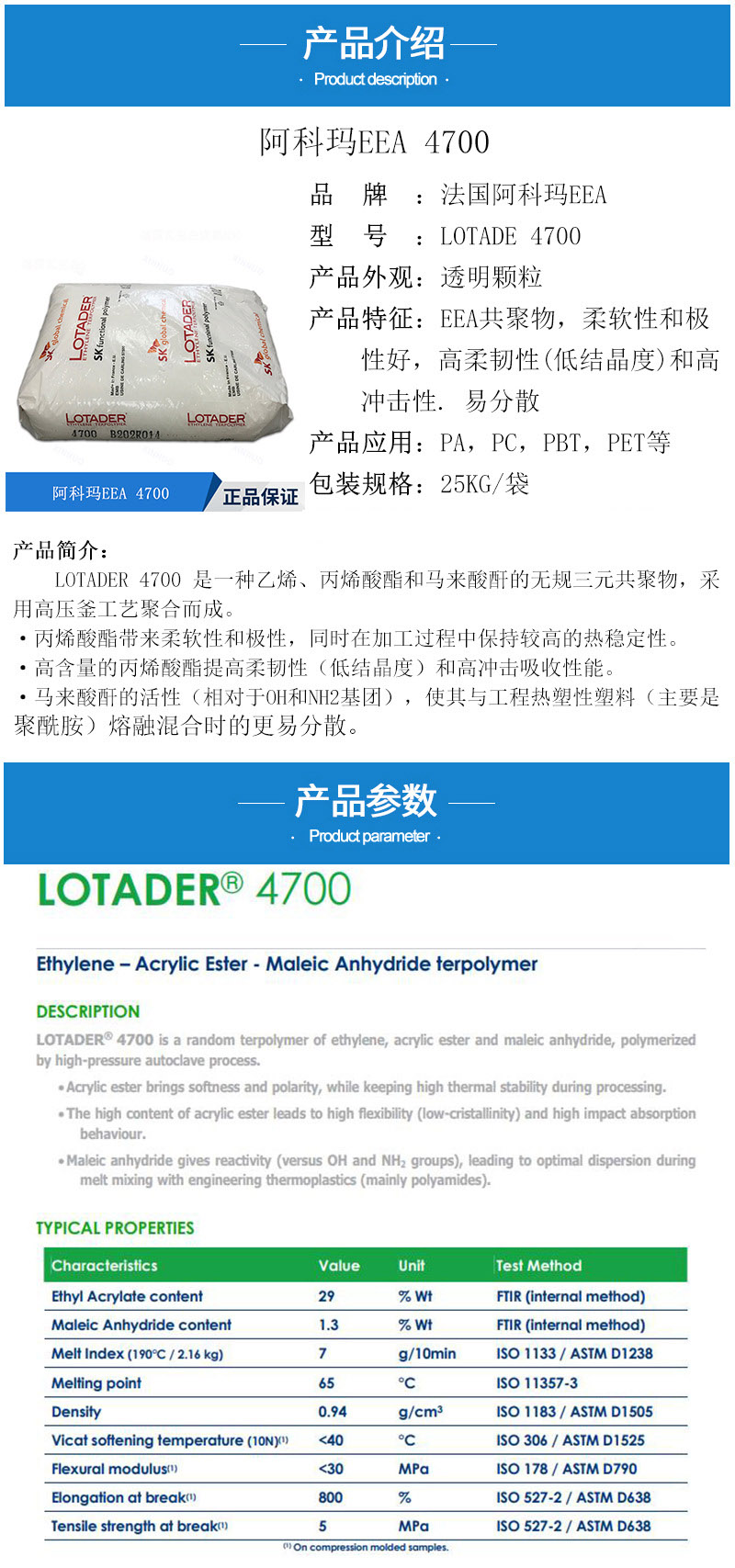 - Lotader EEA 法國阿科瑪 4700 MAH 三元共聚物 高抗沖 熱穩定性 物性表, Lotader EEA 法國阿科瑪 4700 MAH 三元共聚物 高抗沖 熱穩定性 產品參數,Lotader EEA 法國阿科瑪 4700 MAH 三元共聚物 高抗沖 熱穩定性 性能表,Lotader EEA 法國阿科瑪 4700 MAH 三元共聚物 高抗沖 熱穩定性 出廠報告, MSDS,, 物質安全資料表, UL黃卡,{ SGS報告, RoHS, 食品級認證, NSF飲用水標準, 產品資料, 產品性能, 出廠報告, 原廠原包, 代理商, 熱變形溫度, 熔指數, 流動系數, 抗沖擊性能、沖擊強度, 低溫韌性、低溫抗沖擊性能, 熔體流動系數、熔體流動速率, 加工工藝、加工參數、加工溫度, 歐盟RoHS 德國FDA 美國FDA 日本FDA