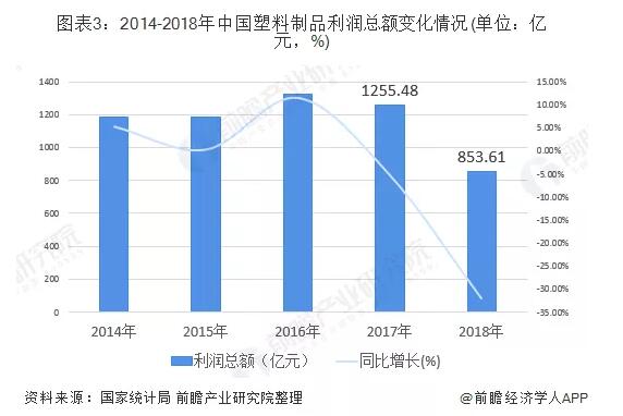 從行業(yè)利潤總額的情況來看,2014-2017年,中國塑料制品行業(yè)利潤總額呈波動上升的趨勢。2017年行業(yè)利潤總額達1255.48億元,2018年行業(yè)利潤總額驟跌至853.61億元,同比上年下降至32.01%。