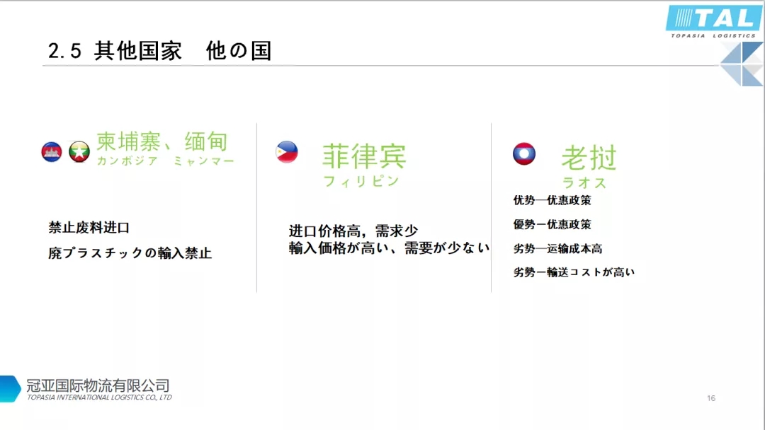 菲律賓碼頭擁擠,國(guó)內(nèi)安全環(huán)境堪憂(yōu),再生資源的利用規(guī)模非常小。進(jìn)口成本比泰國(guó)還高約3500美金/柜,廢塑料企業(yè)很難生存。