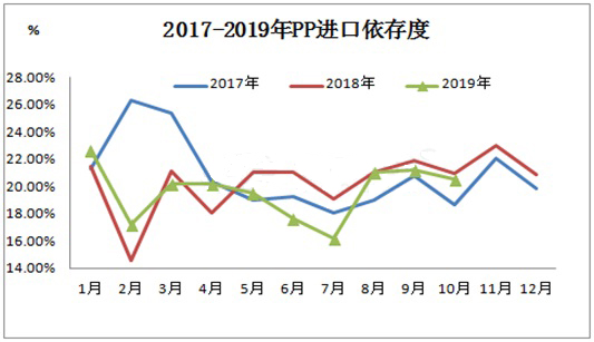2019年PP進口依賴度呈現偏弱震蕩局勢,2019年1-10月進口總量2099.19萬噸,較2018年1-10月份(總量1958.87萬噸)增加140.32萬噸,增幅7.16%。因國內受環保嚴查,對進口廢舊塑料實行嚴格禁止后,國內對PP原料需求相應增加,部分進口資源相應增加,以填補國內需求。但PP進口整體依賴度呈現逐步下降趨勢,目前2019年進口依賴度平均值在19.63%,可見伴隨國內產能不斷激增,部分國產料逐步替代進口產品,進口依賴度也相應下降。