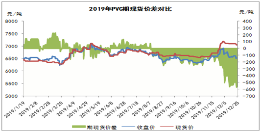近日,受市場供應面有一定提升以及下游接貨不佳影響,PVC行情轉入跌勢。PVC期貨偏弱震蕩,對現貨市場價格形成一定打壓,市場價格承壓下跌。此外,期現貨價差再創新高,最高達570元/噸左右。由上圖可以看出,進入2019年四季度,PVC期限價差逐漸擴大,基本維持在500-600元/噸之間,而期貨價格遠遠低于現貨價格,超出正常范圍。因此單從期現價差方面看,后期將逐漸修復步入正軌,現貨大幅下降的可能性偏大。