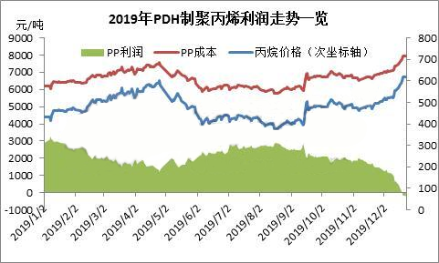 從跟蹤的PDH產業利潤來看,丙烷脫氫制聚丙烯盈利情況持續較好,以華東產品為例,2018年理論盈利在2640元/噸,2019年1-11月份盈利在2184元,持續強于其他工藝盈利水平。然進入12月份,國內液化石油氣價格受國際市場大漲及國內進口資源價格大幅上行帶動,各個地區出現不同幅度調漲,丙烷價格大幅飆升,自11月初至12月底,丙烷國際價格漲幅高達150美元/噸,而反觀國內聚丙烯價格,自11月初至12月底,卻出現了大幅下滑,一再創下年內新低點。丙烷脫氫路線制聚丙烯在中國聚丙烯市場話語權方面仍顯薄弱,對此輪聚丙大跌僅能被動接受,導致丙烷-PDH-PP路線利潤急速下滑,至12月下旬,已進入虧損狀態,考慮當前市場售價,丙烷脫氫制聚丙烯單噸虧損已達200元/噸,且隨著國際市場丙烷價格持續走高,虧損仍有加劇擔憂。