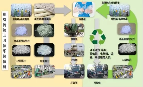 在舊的PET價值鏈中,PET回收、分選和打包站,都是靠拾荒人群,沒有環保成本和對工人的保護,物流效率低下,瓶片賣到化纖企業,再生產品沒有很高附加值。而現在這種模式已經難以為繼,品牌企業的加入,對于高品質可追溯PET瓶的要求,城市垃圾分類,環保執法,致使拾荒人群逐步消失,取而代之的是高品質回收體系,回收+互聯模式的構建,同時這也增加了回收系統的成本。用再靠賣給化纖工廠這些方式已經不能的低端低值應用,無法維持PET的價值鏈。