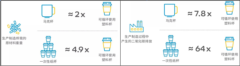 研究數據顯示:以一個普通大小的杯子為例,可循環使用的塑料杯對比馬克杯和一次性紙杯,無論在生產過程中的原材料損耗還是二氧化碳排放都占據優勢。