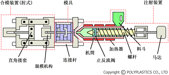 注塑成型機器可以分為兩種裝置:分別為合模裝置與注射裝置。