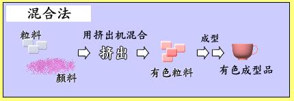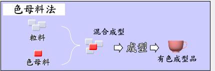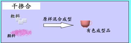 這種方法主要在注塑成型時,把顏色溶度高的有色母料混合到著色材料中,主要用于黑灰色產(chǎn)品著色。