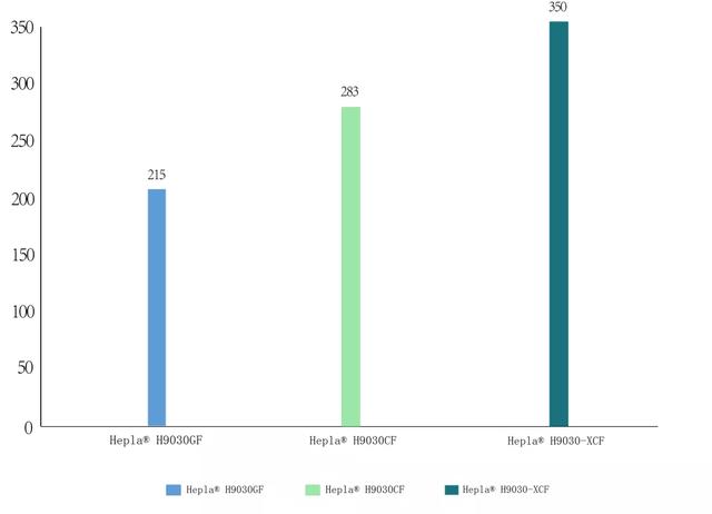 下圖為Hepla? H9030-XCF與Hepla? H9030CF、Hepla? H9030GF在200℃條件下的拉伸強度對照圖。