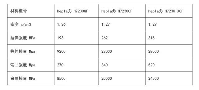 該產品具有優異的機械強度與抗沖擊能力,尺寸穩定性高、翹曲低,材料性能較進口產品提升30%。以高溫尼龍為基材的Hepla? H9000-XCF系列碳纖維復合材料,彎曲剛度超過52GPa,彎曲強度高達520MPa,拉伸強度達到360MPa;以PA66為基材的Hepla? H7200-XCF系列拉伸強度達到315MPa。 采用新產品生產的零部件比鋼制零部件輕75%,比鋁合金部件輕40%,可替代大部分金屬,從而為汽車輕量化及其它行業“以塑代鋼”提供更好的解決方案。