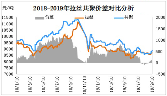 ????????2018-2019年P(guān)P拉絲、共聚在7-8月處于僵持低迷狀態(tài),業(yè)者對(duì)長(zhǎng)期成交疲態(tài)市場(chǎng)看空情緒明顯加重。商家因擔(dān)憂后市,低價(jià)甩貨明顯增多。9月市場(chǎng)受兩油庫(kù)存快速消耗及期貨連漲支撐,市場(chǎng)呈現(xiàn)絕地反彈局勢(shì),拉絲與共聚價(jià)差逐步拉開(kāi)距離。目前拉絲與共聚價(jià)差已經(jīng)由原來(lái)持平狀態(tài),擴(kuò)大至100-200元/噸。根據(jù)目前拉絲與共聚成本價(jià)差計(jì)算,共聚高于拉絲300-400元/噸屬于正常價(jià)差,拉絲與共聚有價(jià)差有進(jìn)一步擴(kuò)大趨勢(shì)。