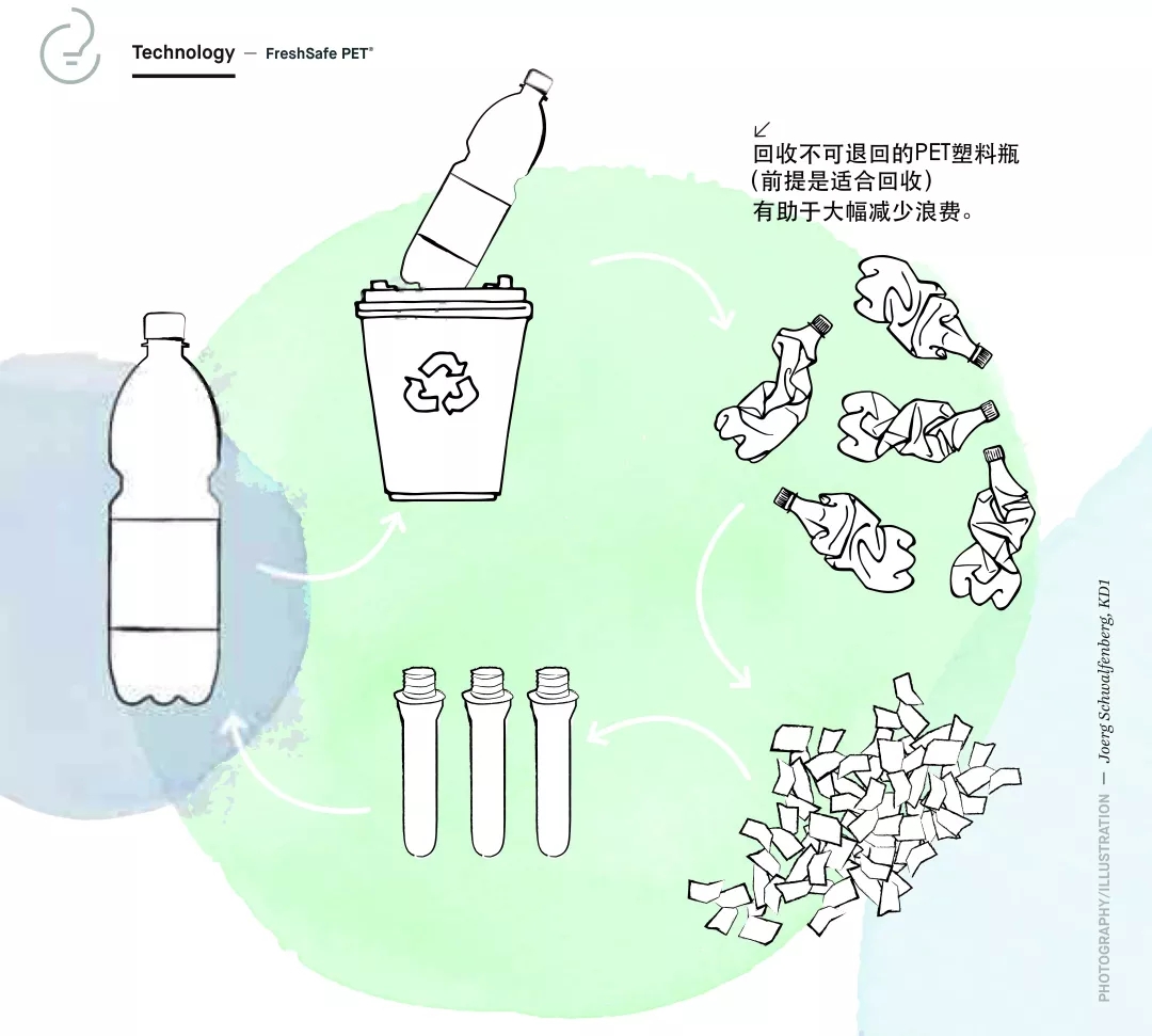 ????????“玻璃涂覆的PET塑料瓶使得果汁和甘露飲料瓶能夠與其他用過的PET塑料瓶(如礦泉水瓶或碳酸飲料瓶)一起被回收和利用。”