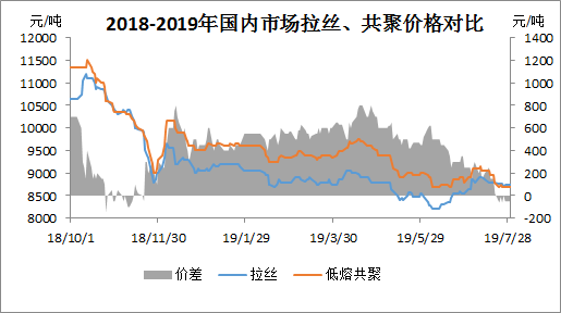 ????????進(jìn)入7月份以來,隨著PP期貨的大幅拉漲,作為標(biāo)品的PP拉絲跟漲迅速,作為非標(biāo)品的共聚,漲幅跟進(jìn)較為緩慢,國內(nèi)聚丙烯現(xiàn)貨市場拉絲與共聚市場價格出現(xiàn)平水的現(xiàn)象,從2016年至今拉絲與共聚平水的現(xiàn)象僅出現(xiàn)過兩次,目前已經(jīng)進(jìn)入倒掛態(tài)勢,拉絲價格高出共聚300元/噸之多。