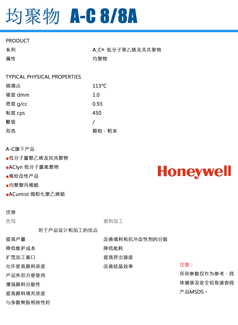 - Honeywell霍尼韋爾 A-C 8A 蠟粉 物性表, Honeywell霍尼韋爾 A-C 8A 蠟粉 產(chǎn)品參數(shù),Honeywell霍尼韋爾 A-C 8A 蠟粉 性能表,Honeywell霍尼韋爾 A-C 8A 蠟粉 出廠報(bào)告, MSDS,, 物質(zhì)安全資料表, UL黃卡,{ SGS報(bào)告, RoHS, 食品級(jí)認(rèn)證, NSF飲用水標(biāo)準(zhǔn), 產(chǎn)品資料, 產(chǎn)品性能, 出廠報(bào)告, 原廠原包, 代理商, 熱變形溫度, 熔指數(shù), 流動(dòng)系數(shù), 抗沖擊性能、沖擊強(qiáng)度, 低溫韌性、低溫抗沖擊性能, 熔體流動(dòng)系數(shù)、熔體流動(dòng)速率, 加工工藝、加工參數(shù)、加工溫度, 歐盟RoHS 德國FDA 美國FDA 日本FDA