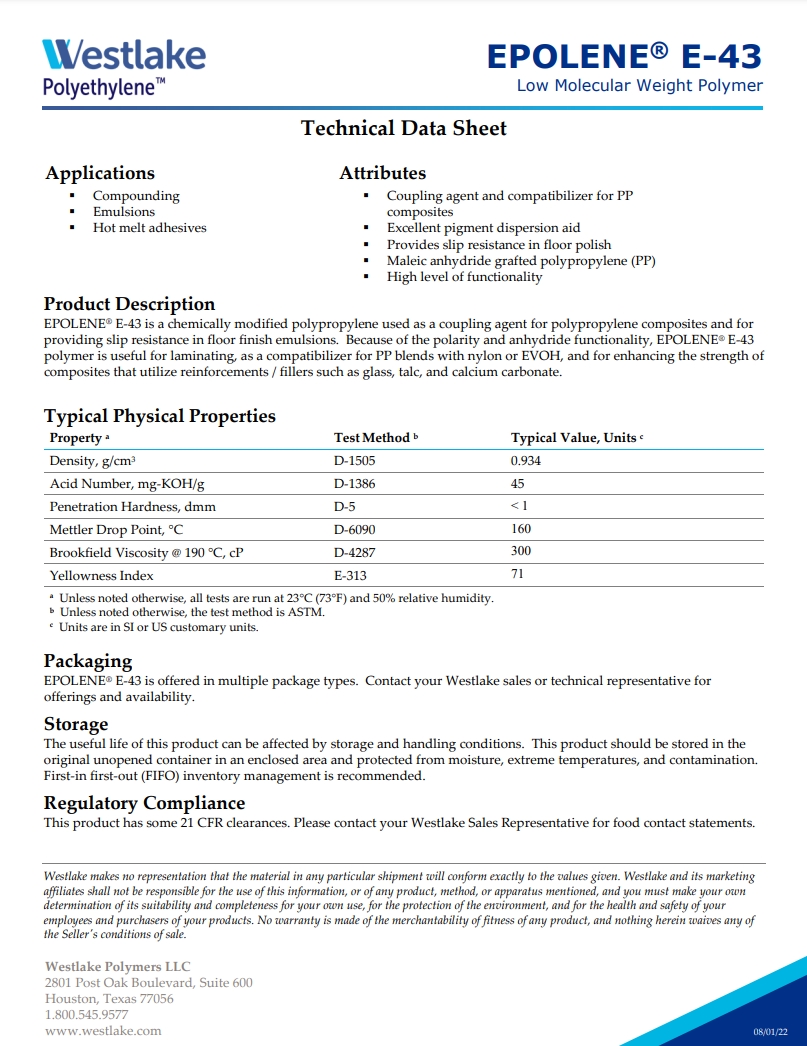 - 西湖化學(xué) E43 Westlake酸酐接枝聚丙烯蠟 EPOLENE E-43 物性表, 西湖化學(xué) E43 Westlake酸酐接枝聚丙烯蠟 EPOLENE E-43 產(chǎn)品參數(shù),西湖化學(xué) E43 Westlake酸酐接枝聚丙烯蠟 EPOLENE E-43 性能表,西湖化學(xué) E43 Westlake酸酐接枝聚丙烯蠟 EPOLENE E-43 出廠報告, MSDS,, 物質(zhì)安全資料表, UL黃卡,{ SGS報告, RoHS, 食品級認(rèn)證, NSF飲用水標(biāo)準(zhǔn), 產(chǎn)品資料, 產(chǎn)品性能, 出廠報告, 原廠原包, 代理商, 熱變形溫度, 熔指數(shù), 流動系數(shù), 抗沖擊性能、沖擊強度, 低溫韌性、低溫抗沖擊性能, 熔體流動系數(shù)、熔體流動速率, 加工工藝、加工參數(shù)、加工溫度, 歐盟RoHS 德國FDA 美國FDA 日本FDA