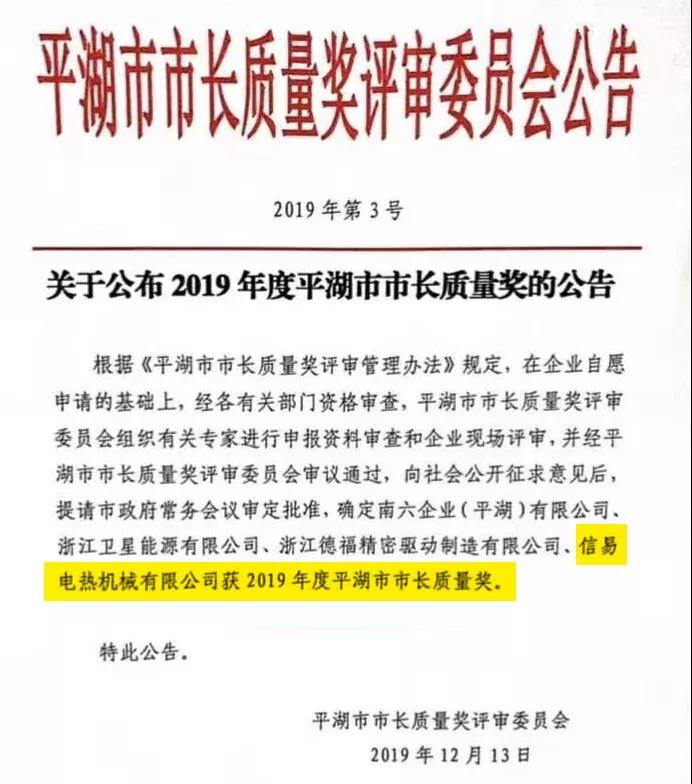 平湖市市長質(zhì)量獎(jiǎng)是平湖市人民政府設(shè)立的最高質(zhì)量獎(jiǎng)項(xiàng),由平湖市政府表彰和獎(jiǎng)勵(lì),每年度評審一次,每屆不超過5個(gè)。該獎(jiǎng)項(xiàng)旨在發(fā)揮市長質(zhì)量獎(jiǎng)的導(dǎo)向作用,推動(dòng)企業(yè)實(shí)施卓越績效模式和先進(jìn)質(zhì)量管理方法,深入開展質(zhì)量管理創(chuàng)新、質(zhì)量強(qiáng)企創(chuàng)建活動(dòng),樹立質(zhì)量標(biāo)桿,加強(qiáng)典型示范,加快推進(jìn)質(zhì)量強(qiáng)市建設(shè),促進(jìn)經(jīng)濟(jì)轉(zhuǎn)型升級。平湖信易2019年度獲此殊榮,深感榮幸,同時(shí)亦感到責(zé)任之深重,今后信易將繼續(xù)在精益管理,保證質(zhì)量,做好品牌等方面努力進(jìn)取,追求卓越,為塑膠輔機(jī)行業(yè)做出更大的貢獻(xiàn)。