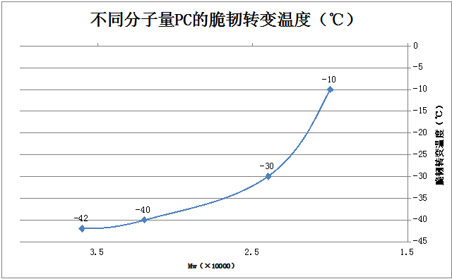 ????????對于有低溫韌性要求的材料來說,脆韌轉變溫度是一個重要參數,PC分子量對其脆韌轉變溫度有重要影響。在PC分子量較高時,其脆韌轉變溫度隨分子量下降而升高并不明顯,如PC分子量由3.6萬下降到3.2萬時,其轉變溫度由-42℃只提升了2℃到-40℃;而PC分子量下降到中等分子量以下(≤2.4萬)時,其脆韌轉變溫度快速上升,由PC2.4的-30℃上升20℃到PC2.0的-10℃。可見,要想制備低溫韌性較好的PC,保持PC較高的分子量是很有必要的。