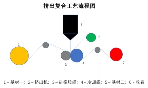 ????????擠出涂覆是將聚乙烯等熱塑性塑料熔融后從扁平機(jī)頭流出,在緊密接觸的兩個(gè)輥筒間將其壓向另一種基材,經(jīng)冷卻后制成復(fù)合膜的一種方法。放卷基材一般是已經(jīng)印刷的PET、BOPP、紙張等材料,如方便面包裝袋就是擠出涂覆生產(chǎn)的典型例子,其結(jié)構(gòu):BOPP印刷膜 / LDPE(或PP)。