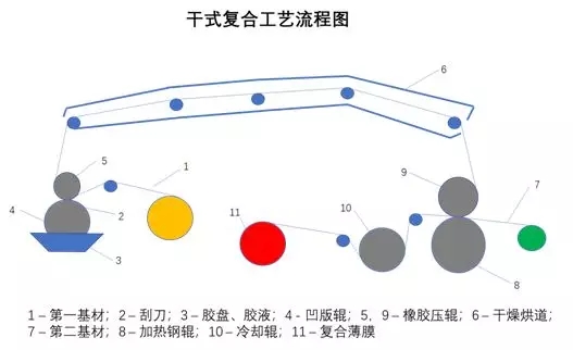????????在復(fù)合膜的各種加工技術(shù)中,干式復(fù)合是我國(guó)最傳統(tǒng)、應(yīng)用最廣泛的一種復(fù)合技術(shù),廣泛應(yīng)用于對(duì)食品、藥品、化妝品、日用品、輕工產(chǎn)品、化學(xué)品、電子產(chǎn)品等的包裝。干式復(fù)合是用涂布裝置(一般采用凹版網(wǎng)線輥涂布)在塑料薄膜上涂布一層溶劑型膠粘劑,經(jīng)復(fù)膜機(jī)除去溶劑而干燥,在熱壓狀態(tài)下與其他基材復(fù)合,如薄膜、鋁箔等粘合成復(fù)合膜,工藝流程如下圖所示,由于它是在膠粘劑“干”的狀態(tài)(無(wú)溶劑狀態(tài))下復(fù)合的,因此叫干式復(fù)合。