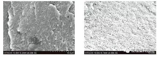 ????????右上圖為添加6% MBS和2% SAN-g-MAH改性回收料的斷面顯微形貌,斷面十分均勻,出現了小而密的孔洞,形成了較為均一的互穿互鎖網狀“海綿”相疇體系。進一步提升了MBS增韌效果,回收料力學性能得到明顯提升。