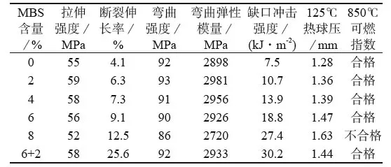 ????????當MBS添加量達8%時,可燃性指數出現不合格。在MBS極限添加量6%基礎上,添加2%增容劑SAN-g-MAH(下表中6+2所示)可進一步提升回收料的綜合力學性能,且可保證可燃性指數合格。