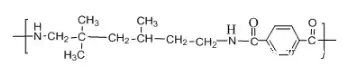 ????????英文名:polytrimethyl hexamethylene terephthalamide;transparent polyamide resin;透明尼龍是無定形聚酰胺,化學名稱為:聚對苯二甲酰三甲基己二胺。其分子結構式為: